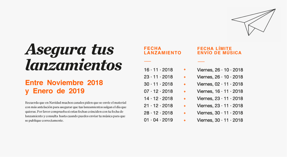 Como cada año os recordamos que durante las fiestas de Navidad muchos de los canales de venta y de streaming piden que los archivos de audio se envíen con mucha más antelación para poder asegurar la publicación de tu música, el día que quieres anunciarlo.